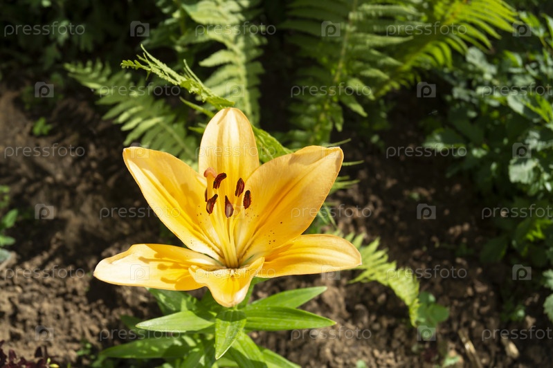 Цветок лилии в саду на фоне зеленых листьев