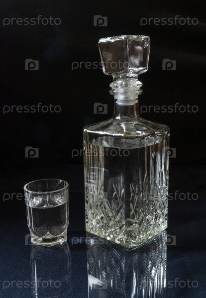 Водка в графине и стакан на столе с отражением