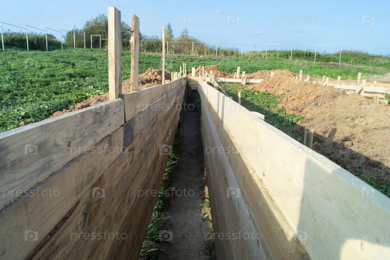 Деревянный каркас для фундамента на земле на фоне неба
