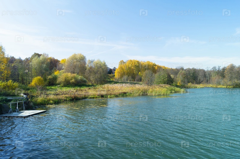 Осенний пейзаж с рекой на фоне голубого неба