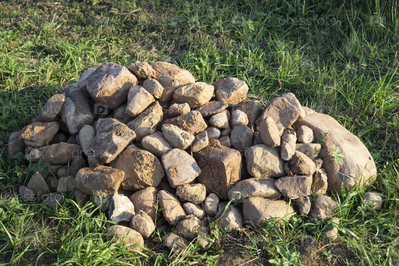 Куча дикого булыжника лежит на зеленой траве