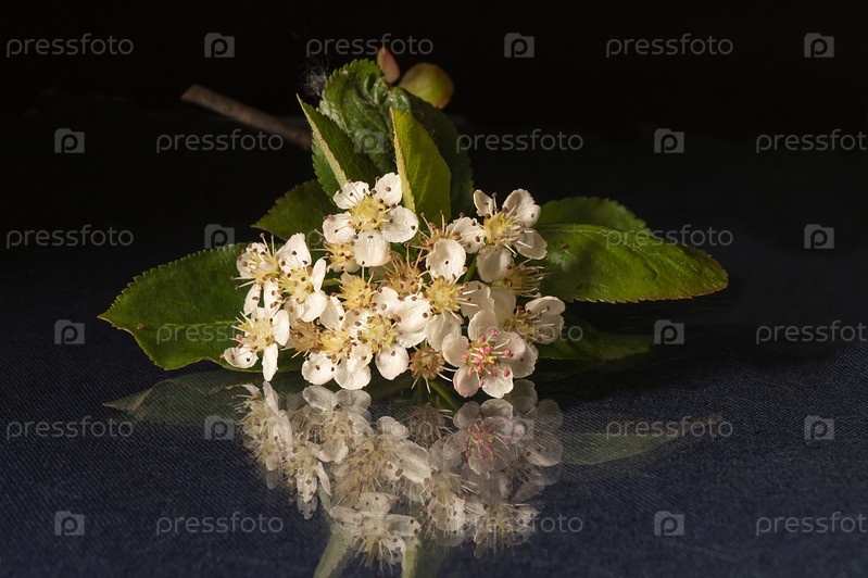 Цветок черноплодной рябины на черном фоне с отражением