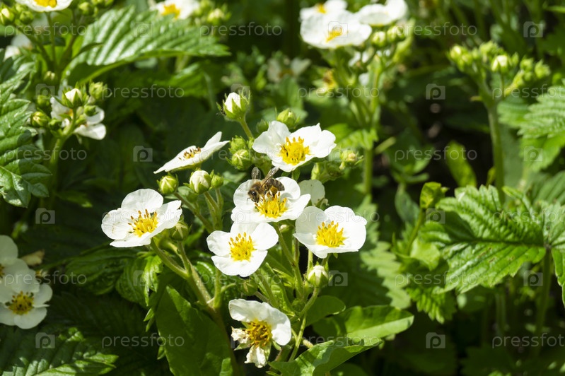 Цветение клубники к весне на фоне зеленого листа
