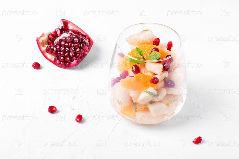 Фруктовый салат с яблоком, грушей, бананом, апельсином, зернами граната и мятой подается в порционном стакане. Десерт без сахара