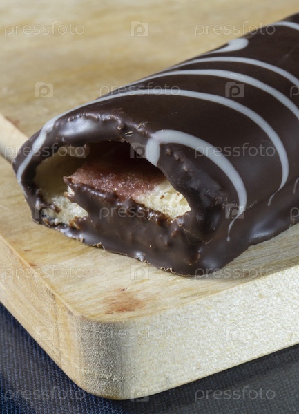 Сладкий рулет на деревянной доске на кухне
