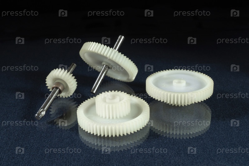 Белая пластиковая шестеренка на столе с отражением
