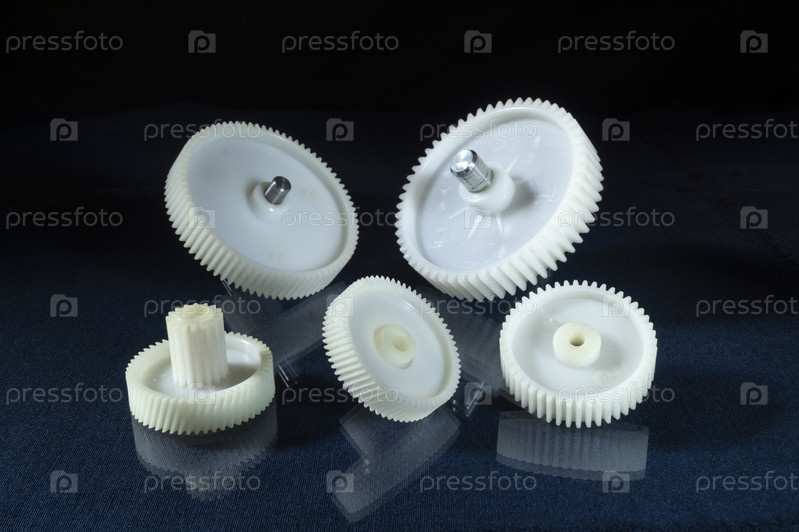 Белая пластиковая шестеренка на столе с отражением