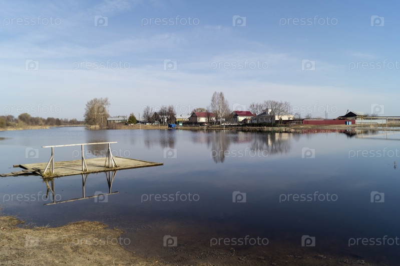 Весеннее наводнение в сельской местности на фоне голубого неба с белым облаком