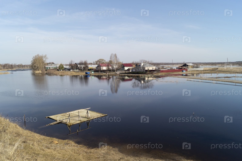 Весеннее наводнение в сельской местности на фоне голубого неба с белым облаком