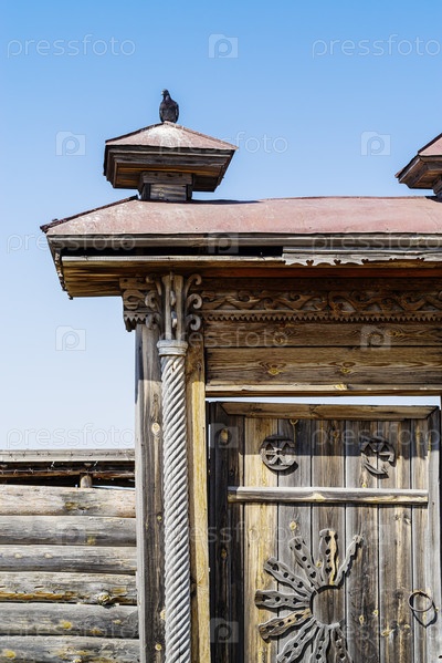 Фрагмент старых резных деревянных ворот загородного дома. Челябинская область, Россия