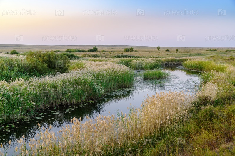 Вечерний летний пейзаж со степной рекой. Река Большая Караганка у села Аркаим, Россия
