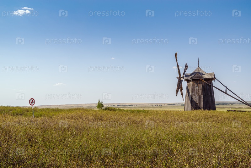 Аркаим, Челябинская область, Россия - 24 августа 2021 г.: Старая ветряная мельница и шуточный дорожный знак "Дон Кихоту вход воспрещен"