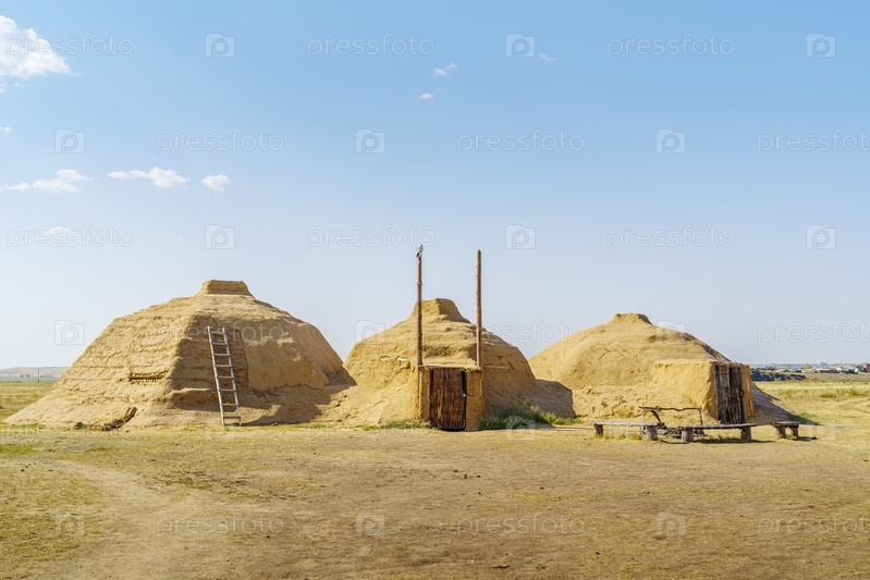 Аркаим, Россия - 24 августа 2021 г.: Археологическая реконструкция жилища каменного века, экстерьер
