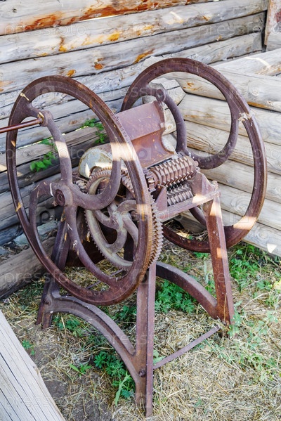 Старый чугунный измельчитель соломы во дворе старого деревенского дома. Казачья усадьба в селе Аркаим, Россия