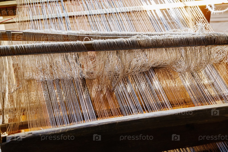 Старый ручной ткацкий станок, крупный план. Казачья усадьба в селе Аркаим, Россия