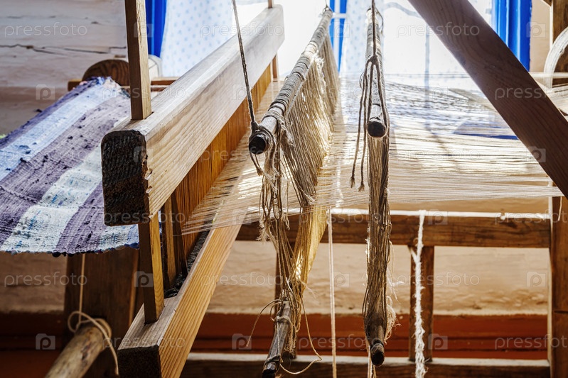 Старый ручной ткацкий станок в интерьере деревенского дома. Казачья усадьба в селе Аркаим, Россия