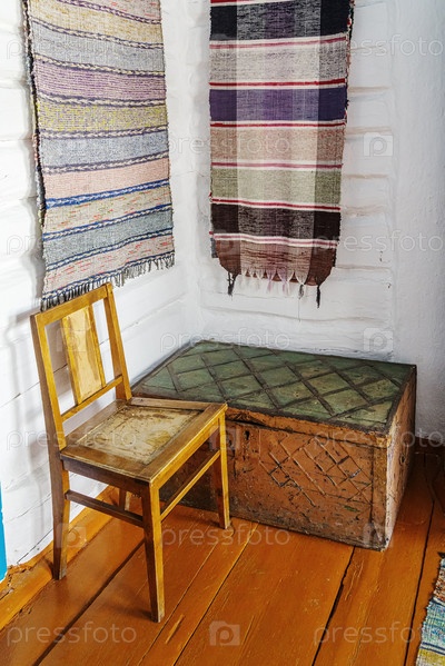 Старый деревянный сундук, окованный железом, в углу деревенского дома. Казачья усадьба в селе Аркаим, Россия