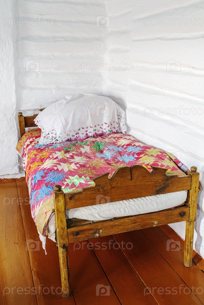 Аркаим, Россия - 24 августа 2021 г.: Старая деревянная кровать с лоскутным одеялом в интерьере старинной казачьей усадьбы
