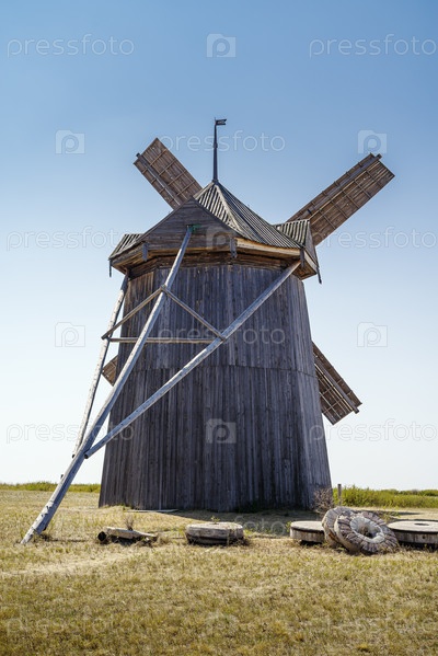 Старая деревянная ветряная мельница и старые жернова. Челябинская область, Россия
