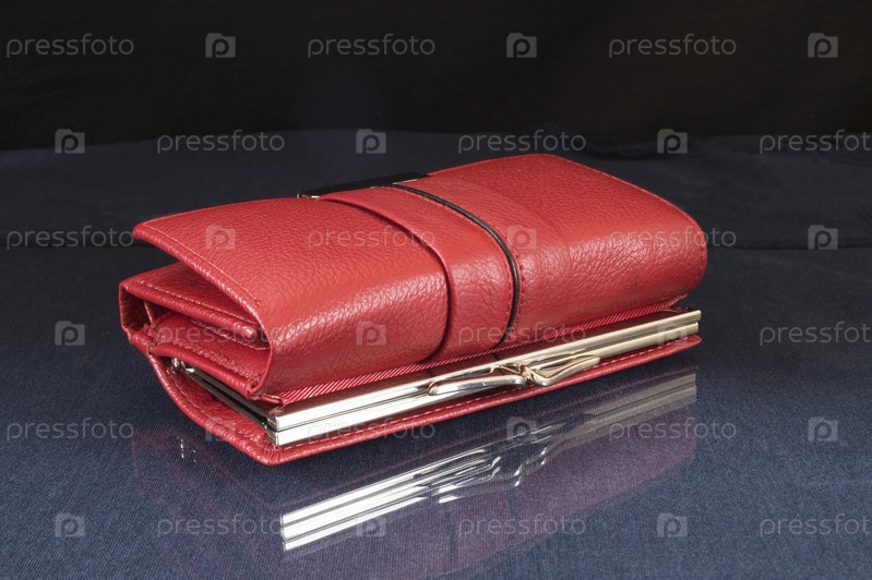 Красный кошелек лежит на столе с отражением