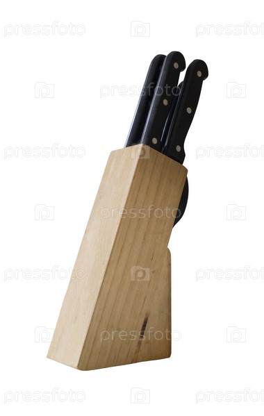 Деревянная подставка для ножей на белом фоне