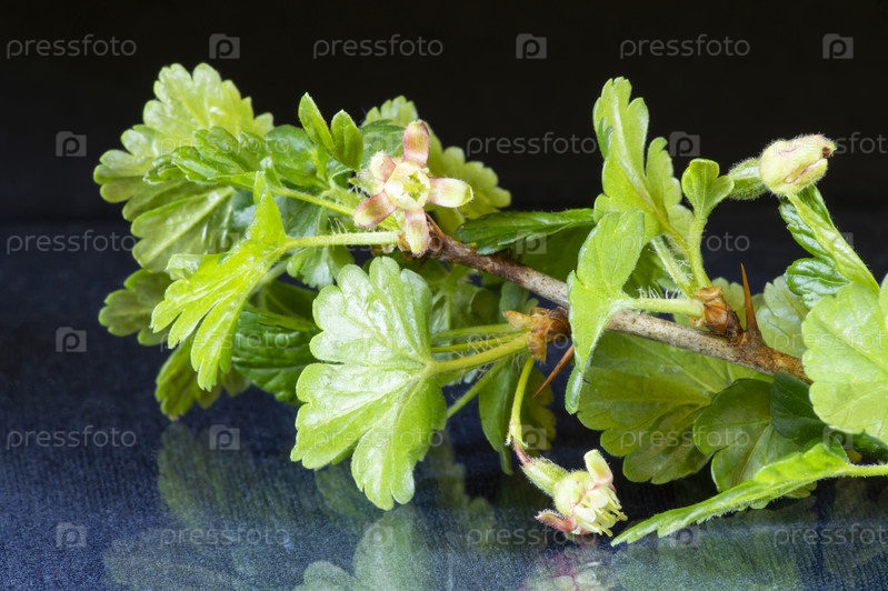 Ветка цветущего крыжовника с зелеными листьями на столе с отражением