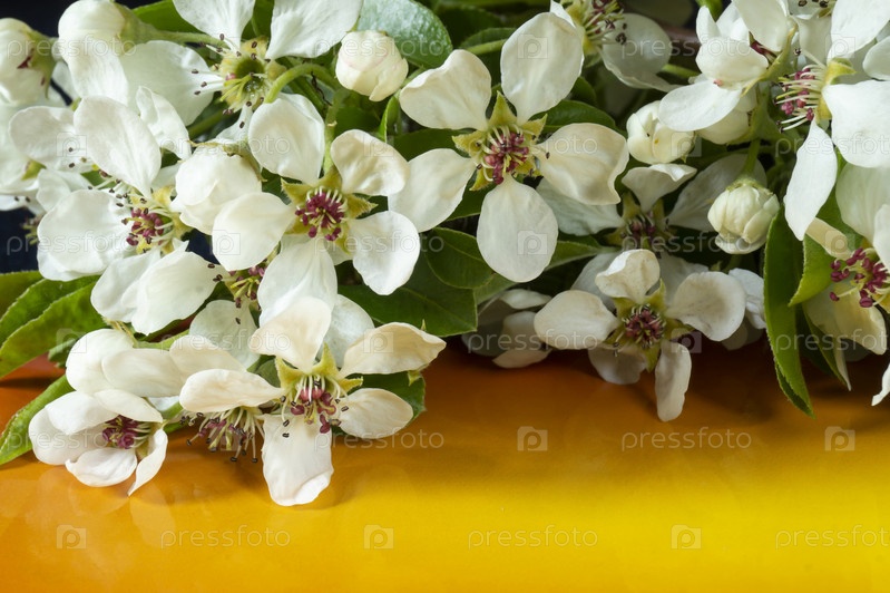 Ветка цветущей груши на оранжевом столе