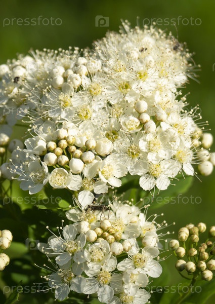 Цветущий куст спиреи на зеленом фоне весной