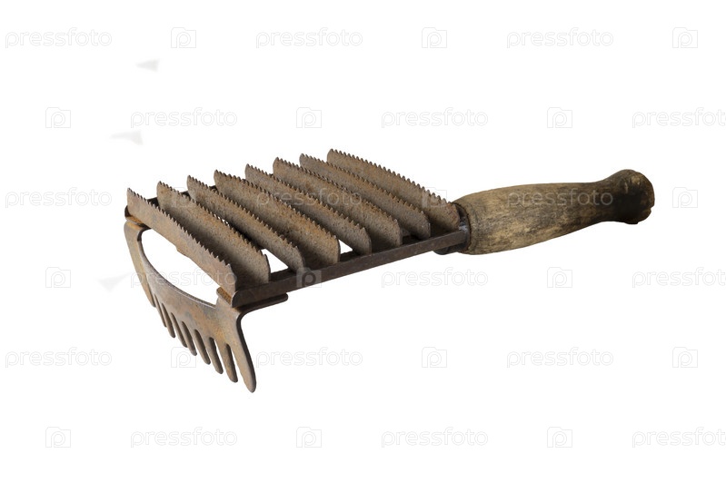 Старая металлическая щетка с деревянной ручкой для ухода за домашними животными