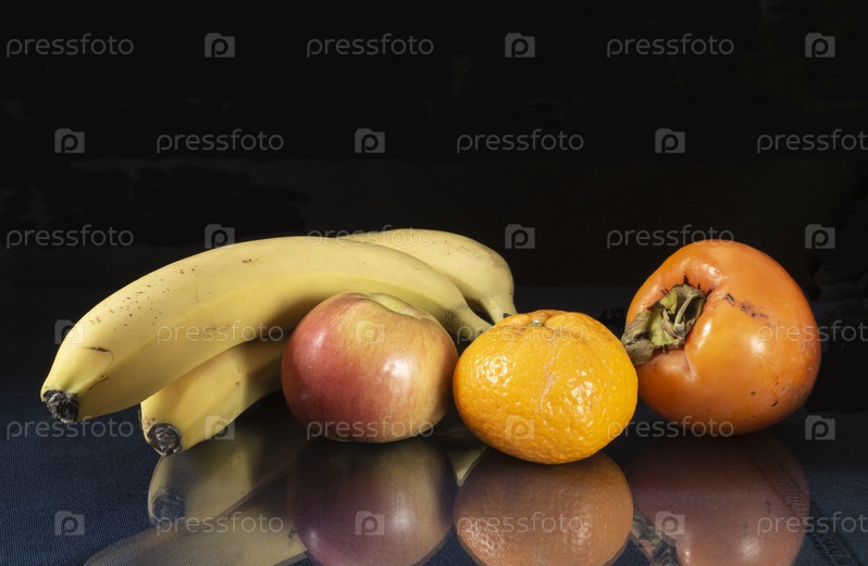 Банан, яблоко, мандарин и хурма на столе с отражением
