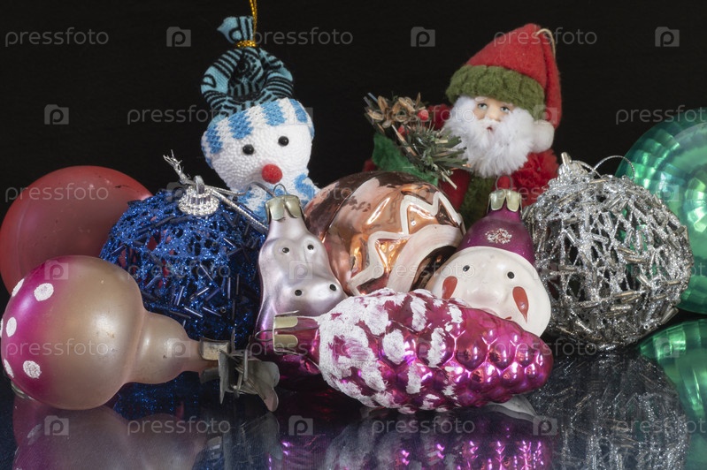 Игрушки для елки на черном фоне с отражением на столе