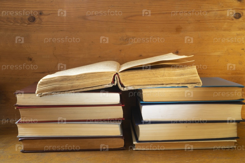 Стопка книг опирается на деревянную полку