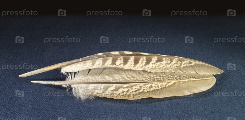 Красивое перо фазана лежит на синем столе