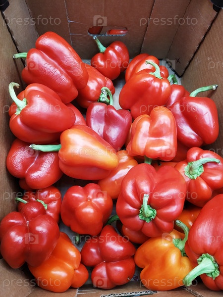 Красный спелый перец в бумажной коробке