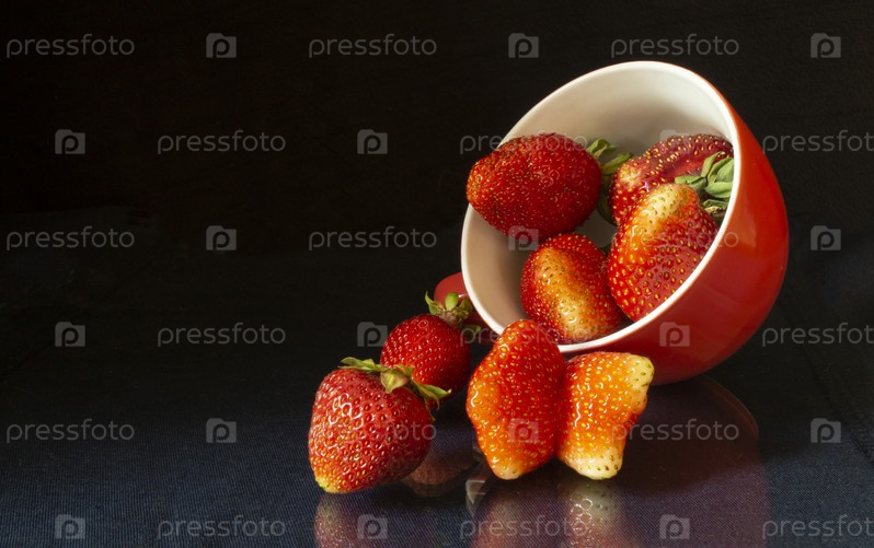 Клубника в чашке на черном фоне и стол с отражением