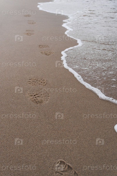 Следы кроссовок на песке на пляже возле моря. Морская пена