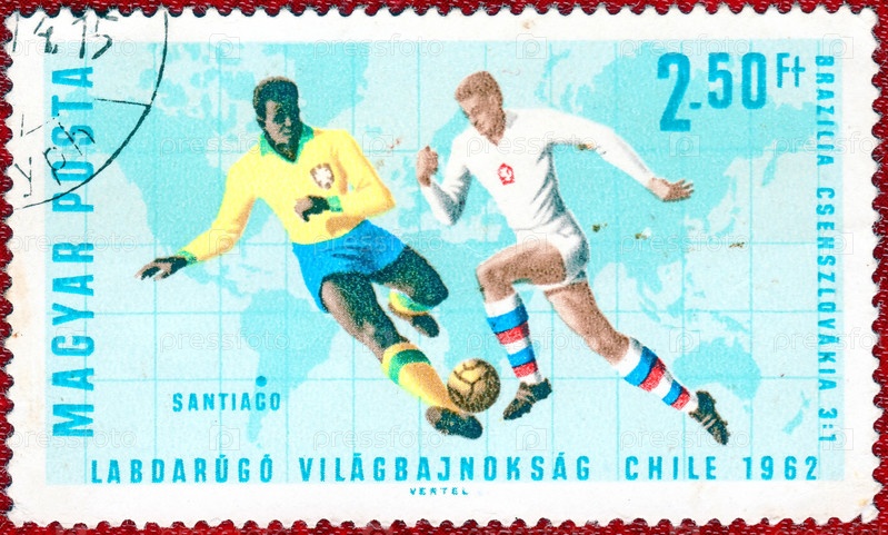 ВЕНГРИЯ-ОКОЛО 1966 года: Почтовая марка, напечатанная в Венгрии с изображением футболистов, с надписью "Чемпионат мира по футболу Чили 1962 Бразилия-Чехословакия 3:1", из серии "Чемпионат мира"