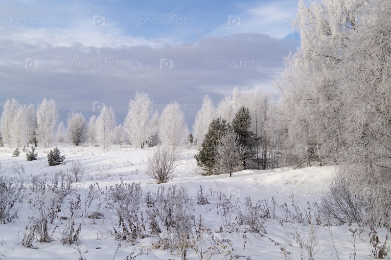 Сельский пейзаж зимой на фоне голубого неба с облаками