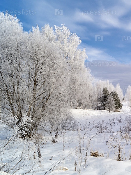 Сельский пейзаж зимой на фоне голубого неба с облаками