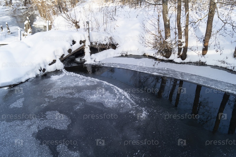 Поток в зимнем лесу на фоне голубого неба с облаком