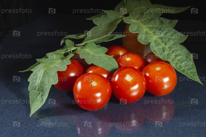 Спелые помидоры на столе с зеленым листом