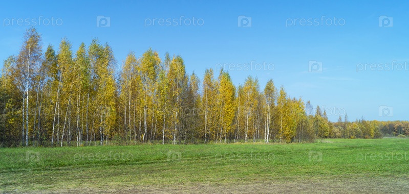 Осенний пейзаж с березой у дерева на фоне голубого неба