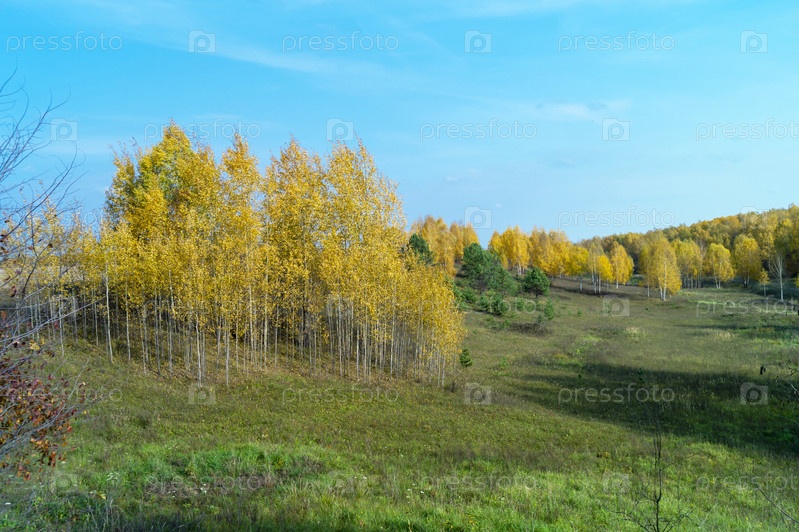 Осенний пейзаж с березой у дерева на фоне голубого неба