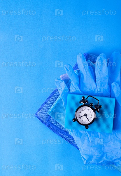 Чистящий набор синего цвета. Тряпки, чистящая губка, латексные перчатки и будильник на синем фоне. Монохромная плоская планировка. Время генеральной уборки