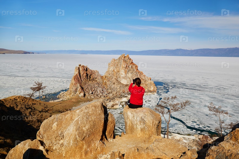 Озеро Байкал во время таяния льда. Путешественница фотографирует мыс Бурхан
