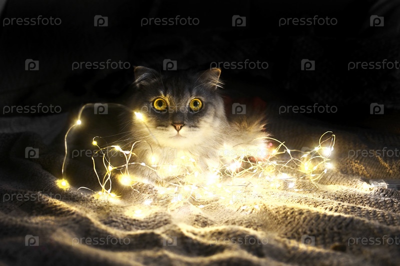 Рождественский кот лежит в ярких гирляндах на теплом вязаном одеяле. Крупный план. Настоящее новогоднее фото. вертикальный