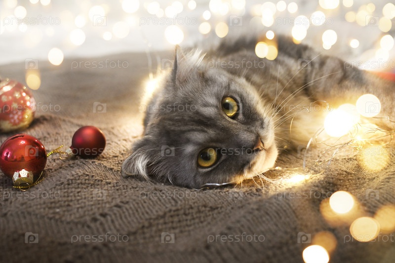 Рождественский кот лежит в ярких гирляндах на теплом вязаном одеяле. Крупный план. Настоящее новогоднее фото. вертикальный