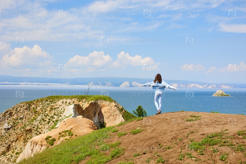 Летом молодая девушка путешествует по Байкалу. Красивый пейзаж острова Ольхон