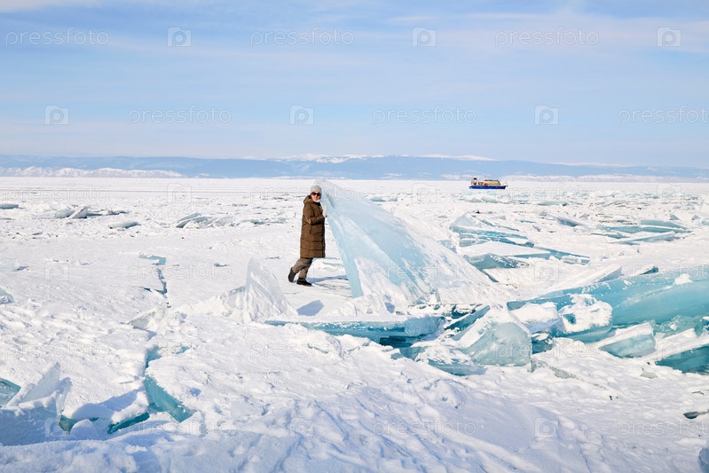Молодая женщина стоит у огромной глыбы прозрачного голубого льда