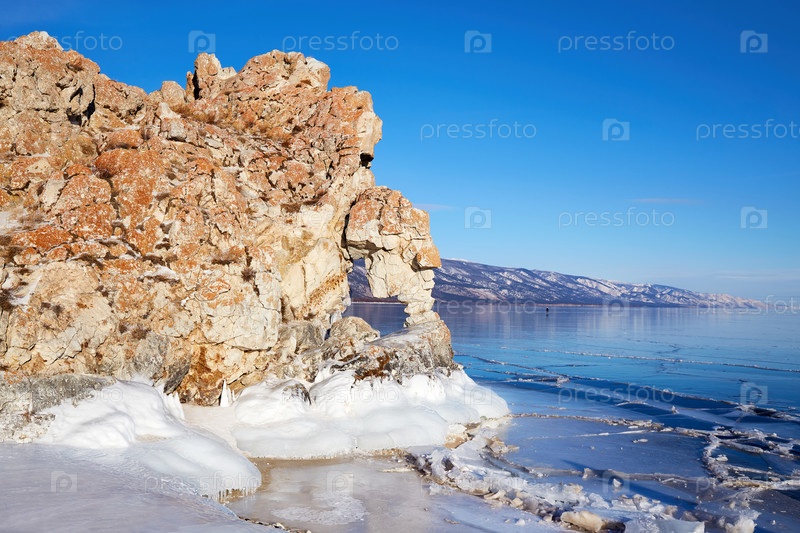 Замерзшее озеро Байкал, прозрачный лед. Арка в форме сердца в скале Цаган-Хушун или окно желаний